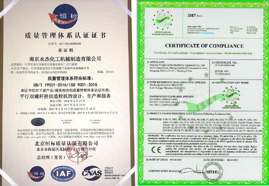 我司的所有造粒機(jī)組產(chǎn)品均通過了CE和ISO9001認(rèn)證,質(zhì)量有保障: